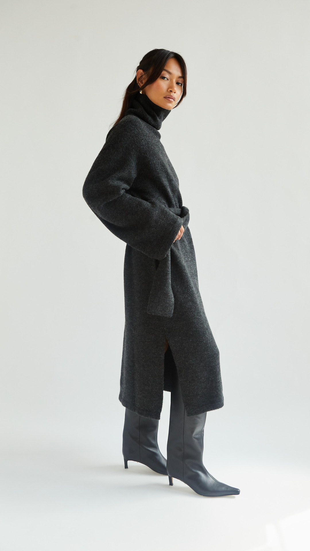 Chic roll neck midaxi length dress in super soft stretch knitwear. Team with heeled-boots for an effortless winter evening look or unbelted for a polished day outfit. Fluted sleeves for a modern look that you will love wearing. Side split makes it perfect to style with high boots for an easy elevated look
