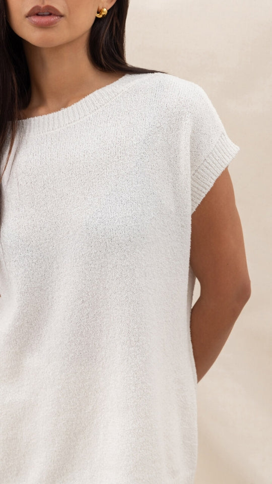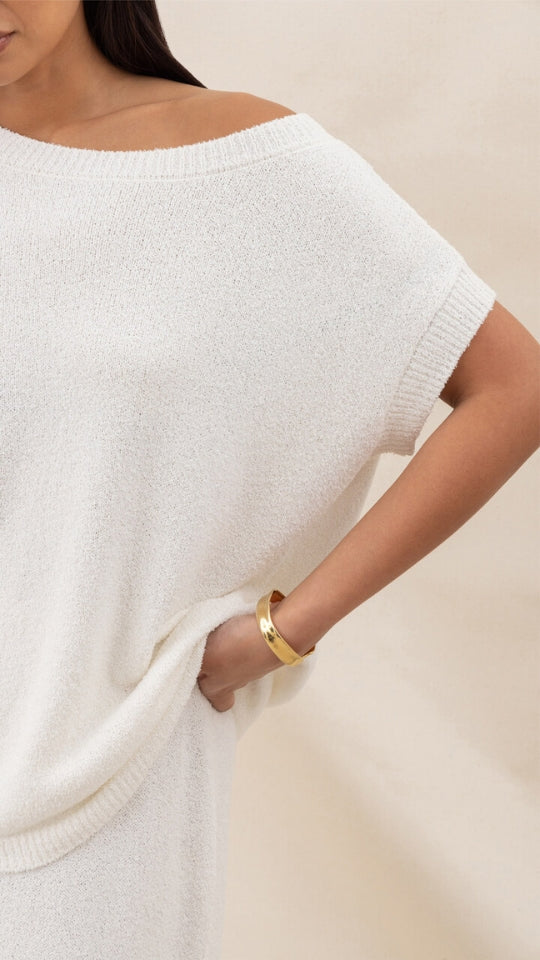 The textured cotton bouclé knit offers a touch of subtle sophistication. Wear off the shoulder for styling versatility. Relaxed fit top that you will keep coming back to all season long